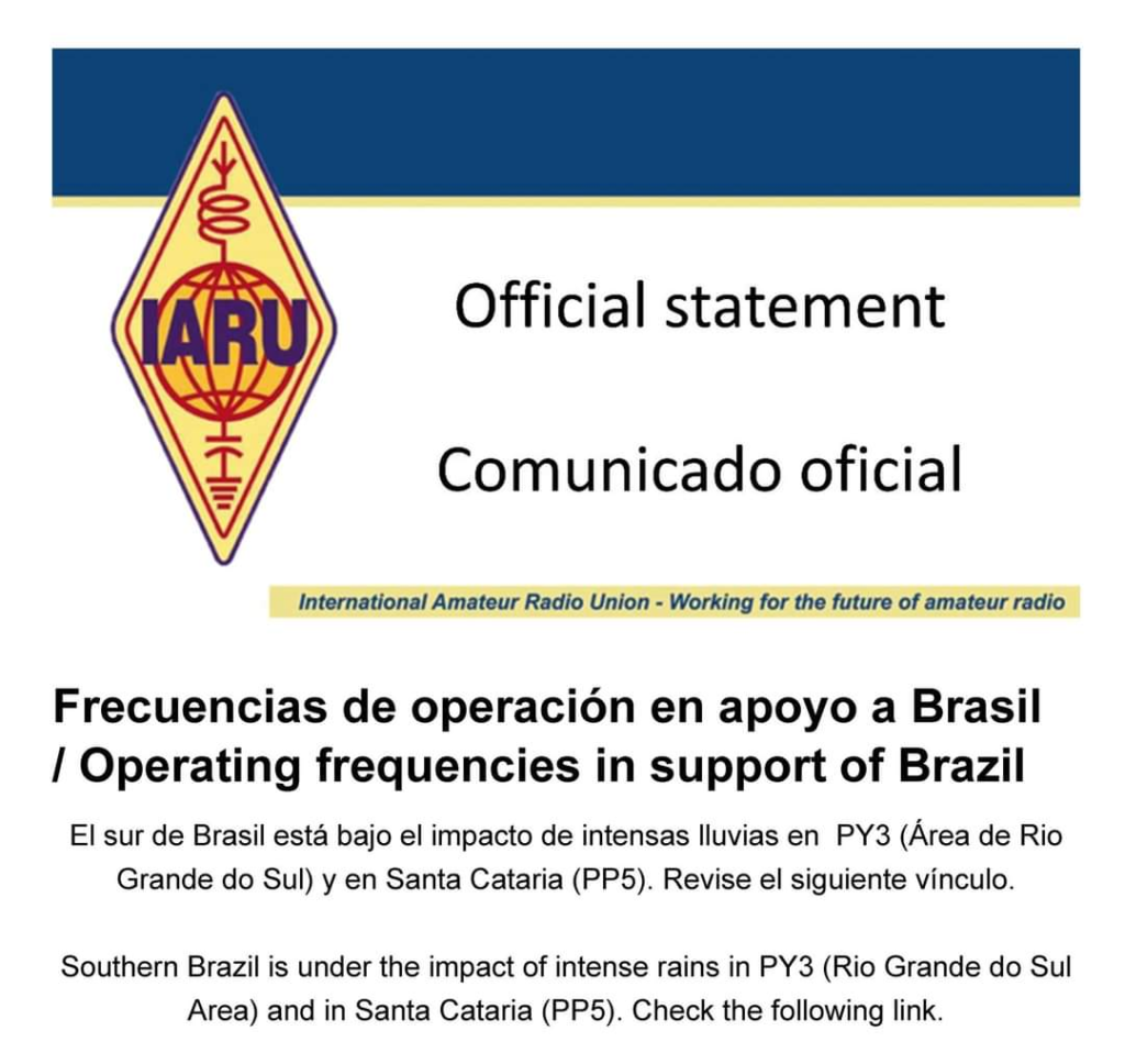 Se solicita divulgar que se debe dejar libre la frecuencia 7060 en banda de 40 metros (7mhz), ordenada por IARU debido a las intensas lluvias que están azotando a Brasil.